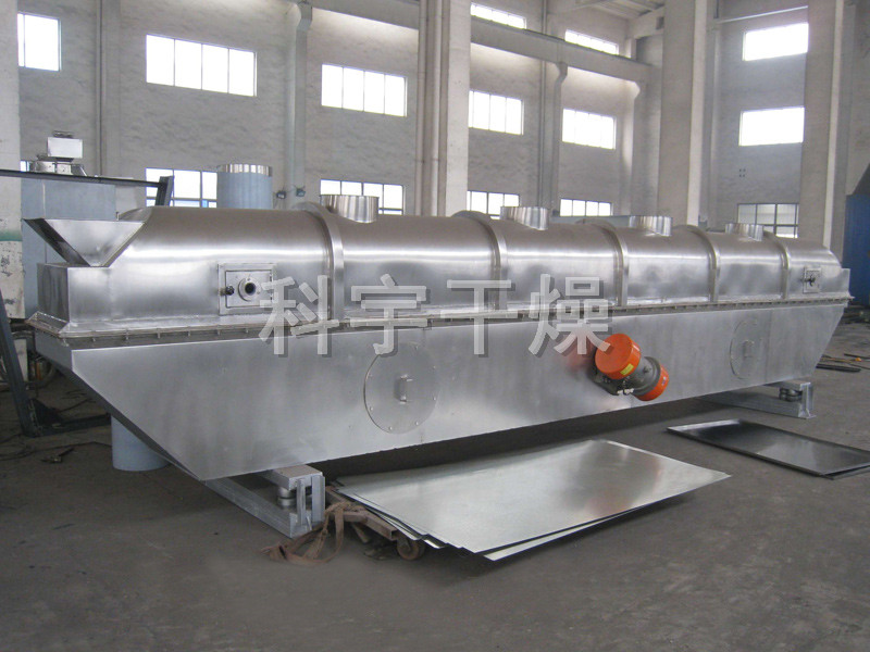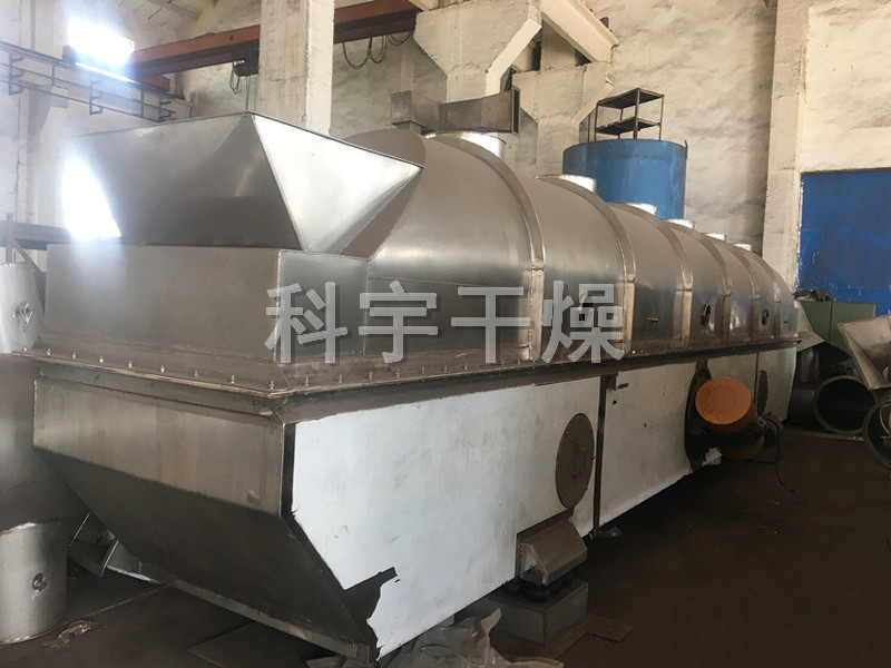 物料自進(jìn)料進(jìn)口進(jìn)入機(jī)內(nèi),在振動(dòng)力作用下,物料沿水平面流化床拋擲,向前連續(xù)運(yùn)動(dòng),熱風(fēng)向上穿過流化床同濕物料換熱后,濕空氣經(jīng)旋風(fēng)分離器除塵后由排風(fēng)1:3排出,干燥物料由排料進(jìn)口排出。