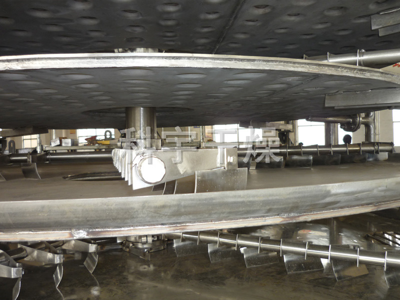 濕物料自加料器連續(xù)地加到干燥器上部第一層干燥盤上,帶有耙葉的耙臂作回轉運動使耙臂作回轉運動使耙葉連續(xù)地翻抄物料。物料沿指數(shù)螺旋線流過干燥盤表面,在小干燥盤上的物料被移送到外緣,并在外緣落到下方的大干燥盤外緣,在大干盤上物料向里移動并從中間落料口落如下一層小干燥盤中。大小干燥盤上下交替排列,物料得以連續(xù)地流過整個干燥器。中空的干燥盤內(nèi)通入加熱介質,加熱介質形式有飽和蒸汽、熱水和導熱油,加熱介質由干燥盤的一端進入,從另一端導出。已干物料從最后一層干燥盤落到殼體的底層,最后被耙葉移送到出料口排出。濕份從物料中逸出,由設在頂蓋上的排濕口排出,真空型盤式干燥器的濕氣由設在頂蓋上的真空泵口排出。從底層排出的干物料可直接包裝。通過配加翅片加熱器、溶劑回收冷凝器、袋式除塵器、干料返混機構、引風機等輔機,可提高其干燥的生產(chǎn)能力,干燥膏糊狀和熱敏性物 料,可方便地回收溶劑,并能進行熱解和反應操作。