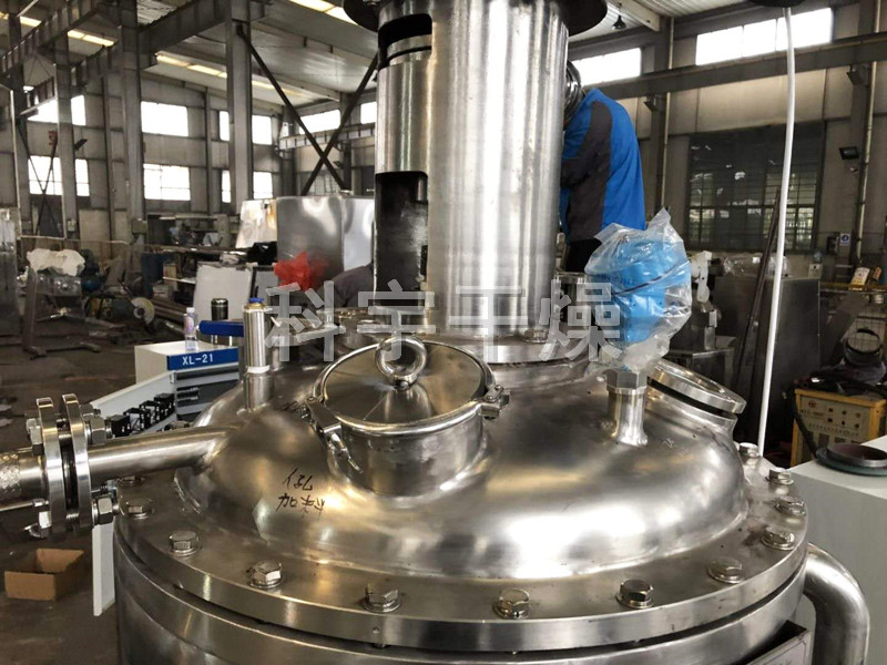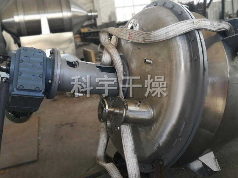 ●干燥階段:濾餅脫水后,通過回轉(zhuǎn)使濾餅疏松,同時,夾套內(nèi)蒸汽對內(nèi)壁進行加熱,通過熱傳導(dǎo)對濾餅進行加熱升溫,濕份迅速蒸發(fā)達到干燥的效果。通過設(shè)備內(nèi)抽真空的方法加快蒸發(fā)速度。通過加入處理后的熱氮氣等介質(zhì)帶走蒸發(fā)的濕份,可加速物料的干燥,提高干燥效果。