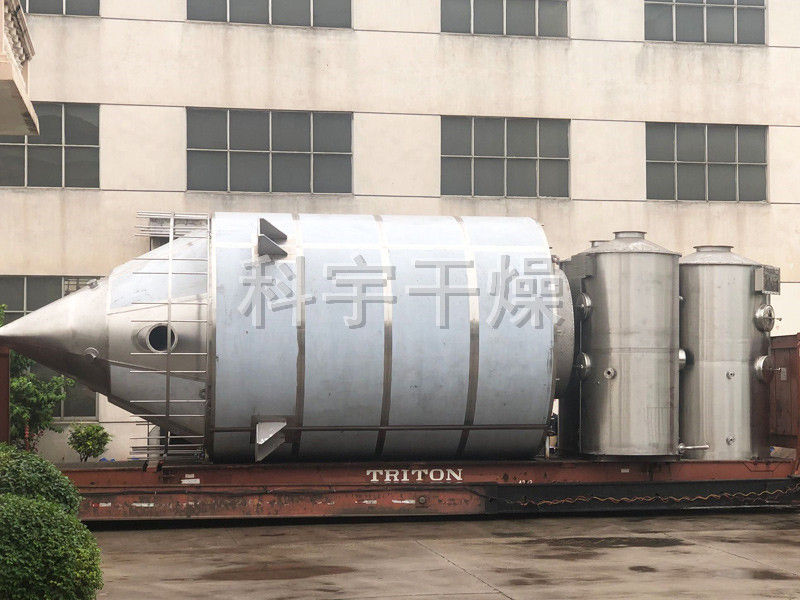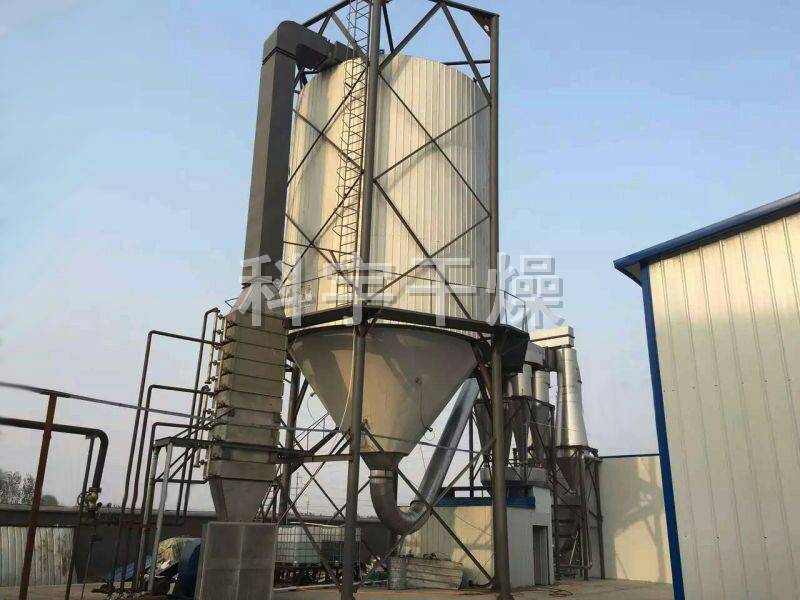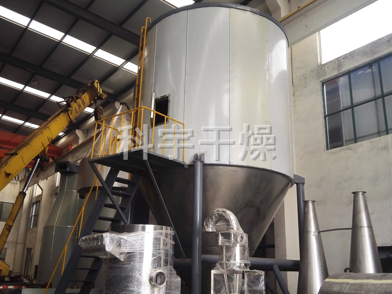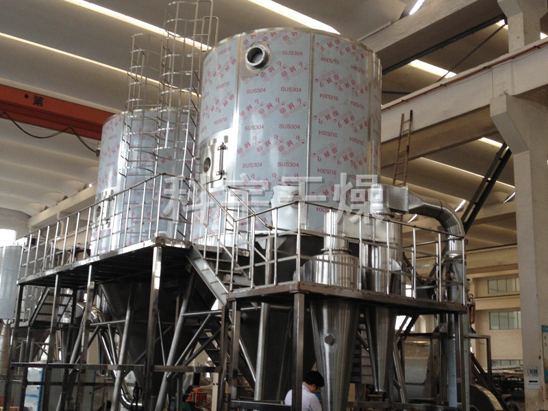 空氣經(jīng)過濾和加熱,進(jìn)入干燥器頂部空氣分配器,熱空氣呈螺旋狀均勻地進(jìn)入干燥室。料液經(jīng)塔體頂部的高速離心霧化器,(旋轉(zhuǎn))噴霧成極細(xì)微的霧狀液珠,與熱空氣并流接觸在極短的時間內(nèi)可干燥為成品。成品連續(xù)地由干燥塔底部和旋風(fēng)分離器中輸出,廢氣由風(fēng)機(jī)排空。