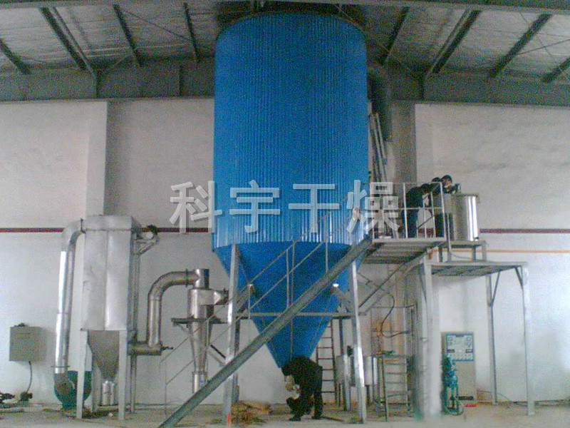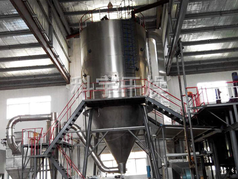 本機(jī)組工作過(guò)程為料液通過(guò)隔膜泵高壓輸入,噴出霧狀液滴,然后同熱空氣并流下降,大部分粉粒由塔底排料口收集,廢氣及其微小粉末經(jīng)旋風(fēng)分離器分離,廢氣由抽風(fēng)機(jī)排出,粉末由設(shè)在旋風(fēng)分離器下端的授粉筒收集,風(fēng)機(jī)出口還可裝備二級(jí)除塵裝置,回收率在96-98%以上。